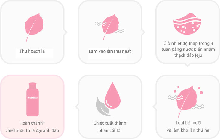 Dòng sản phẩm Cherry Blossom của innisfree sử dụng chiết xuất từ lá anh đào trồng tại vùng Hallim phía tây đảo Jeju. Lá được thu hoạch và làm khô lần thứ nhất, sau đó vủ ở nhiệt độ thấp trong 3 tuần bằng nước biển nham thạch đảo Jeju. Trong quá trình này, các tế bào biểu bì của lá bị phân rã bởi muối trong nước biển, nhờ đó có thể chiết xuất hiệu quả các thành phần làm đẹp trong lá anh đào. Sau khi loại bỏ muối và làm khô lần thứ hai, cuối cùng đã có thành phẩm chiết xuất lá anh đào hoàn chỉnh. Sự tận tâm đầu tư thời gian như vậy để tạo nên nguyên liệu quý chứa đựng trong dòng sản phẩm Cherry Blossom.