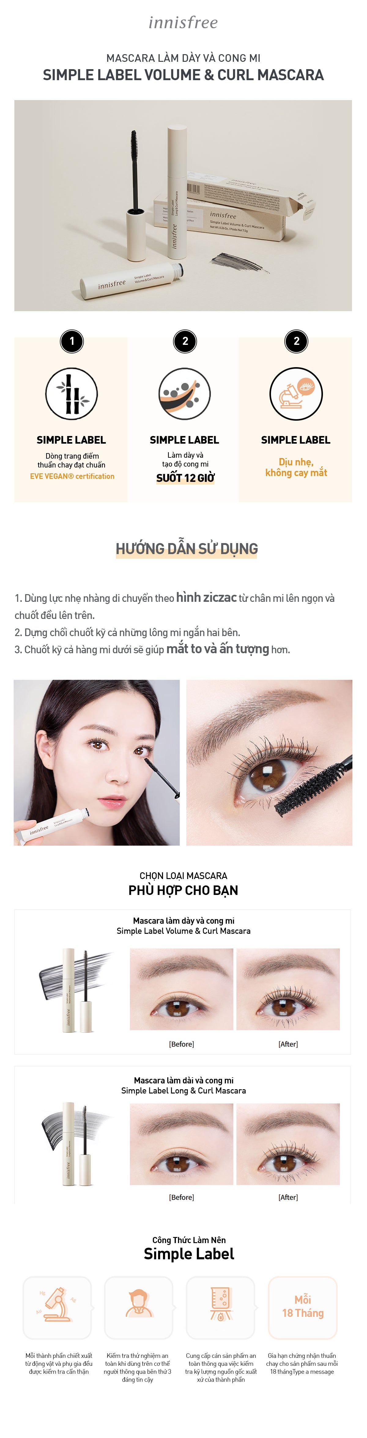 | Tên sản phẩm | Mascara thuần chay, làm dài và cong mi innisfree Simple Label Volume & Curl Mascara 7.5 g |